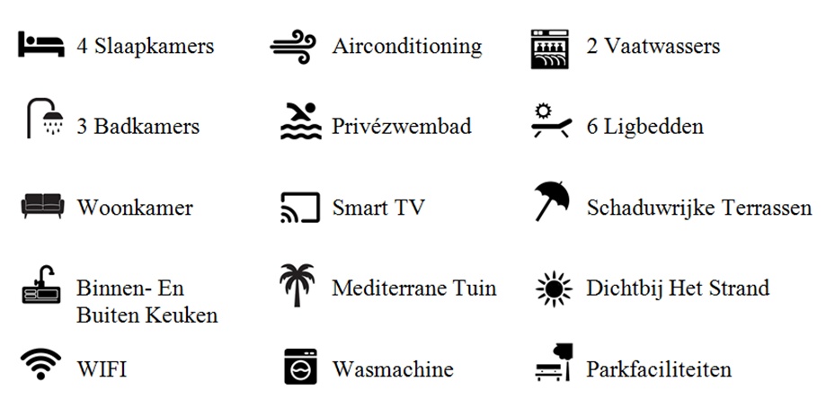De villa telt vier slaapkamers, waarvan drie met airconditioning en comfortabele tweepersoonsbedden. De vierde slaapkamer is ingericht met een stapelbed. Met drie badkamers, waarvan twee ensuite, is er volop privacy voor alle gasten.